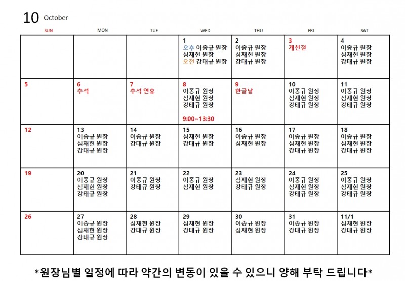 25년 10월 원장님 스케줄입니다.